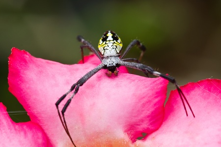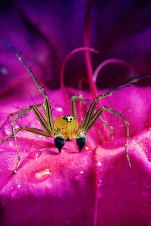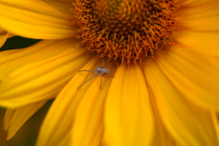 Spider on a yellow flower in the garden, closeup of photo. macro photography