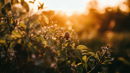 A spider perched on lush green foliage, glowing under the warm light of sunset. This serene scene captures the delicate beauty of nature in a tranquil environment.