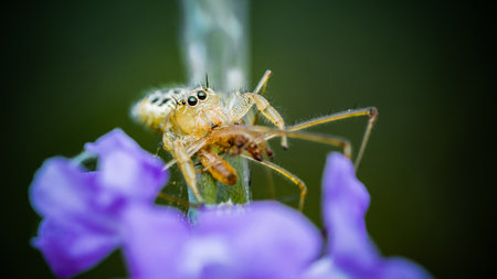 Jumping spider eating prey on green Stachytarpheta jamaicensis tree, Jumping spider and Lynx spider, Selective focus, Macro shot, Natural background, Thailand.