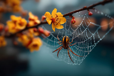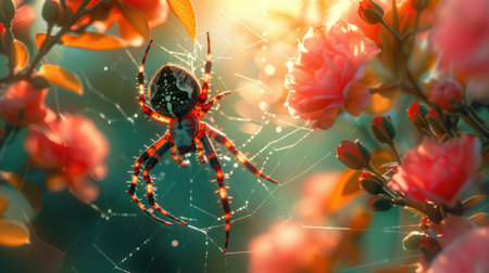A vibrant spider sits on a dew-covered web intricately woven among blooming yellow flowers. the morning light enhances the delicate web and blossoms, creating a serene and captivating nature scene. Generative AI