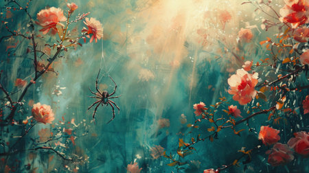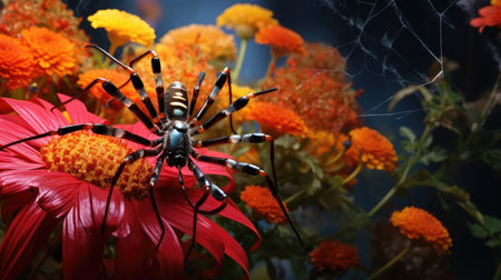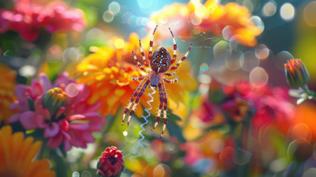 Spider dangling from a thread amidst vibrant flowers, creating a captivating contrast between the elegance of the spider and the blossoms, in a sunlit garden.