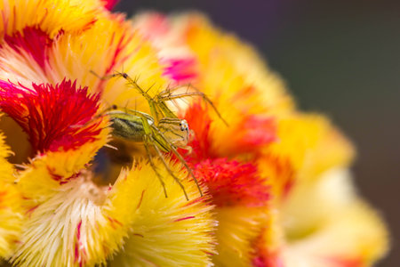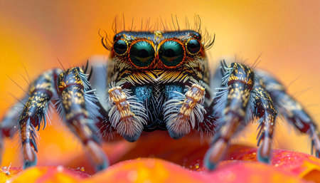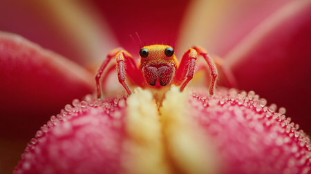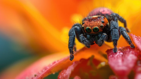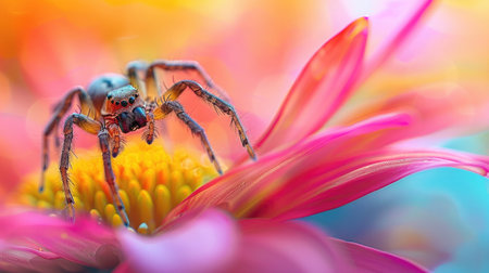 This captivating close-up image features a colorful spider perched on a flower petal, showcasing intricate details and vibrant colors in a natural setting.