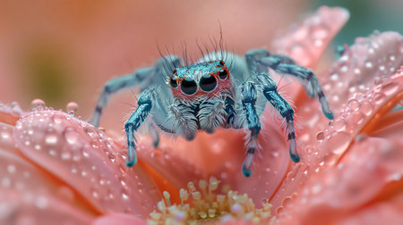 A stunning macro photograph of a jumping spider perched on a flower covered in dew drops, showing intricate details and vibrant colors.