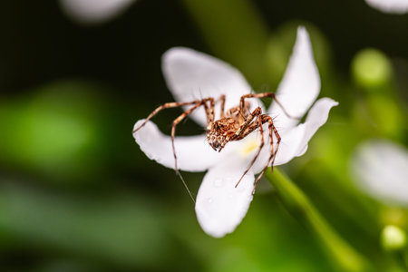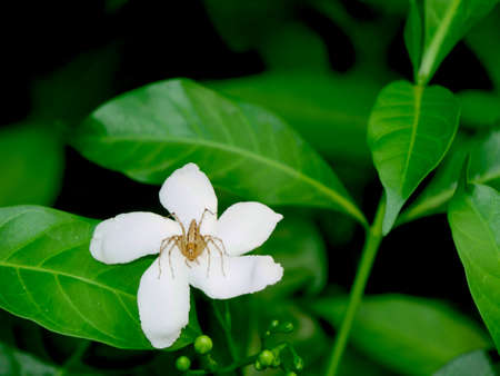 Spider presented on white flower closeup picture on day light with green leaves backdrop.