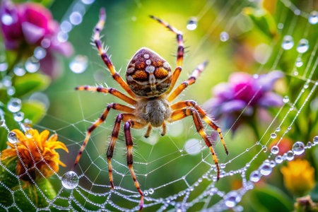 This stunning close-up image captures a spider delicately resting on its glistening web, set against a backdrop of vibrant flowers in full bloom.