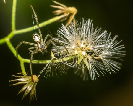 Macro shot of jumping spider (Salticidae) on a spiderweb. Minimalism