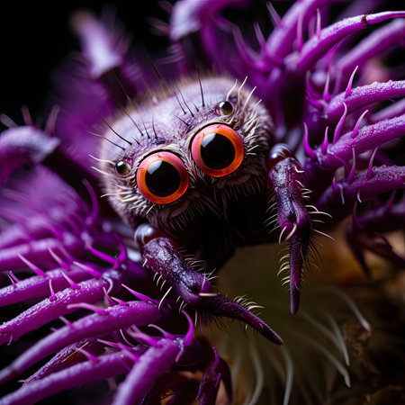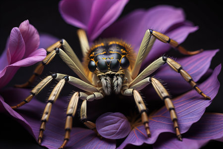 A close-up image of a jumping spider perched on a vibrant purple flower petal, showcasing the intricate details of the spider and the flower's texture.