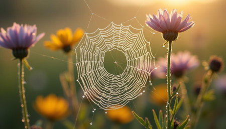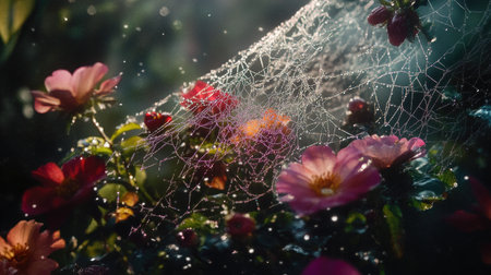Spider web delicately draped across vibrant flowers, glimmering in the fresh morning light.