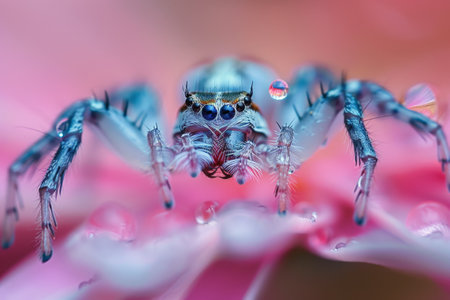 A detailed macro shot of a jumping spider on a vibrant pink surface, surrounded by tiny water droplets. The spiders intricate eyes and furry texture are prominently displayed.