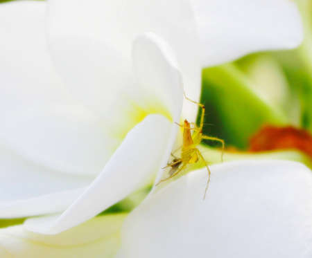 small spider on a white plumeria flower.