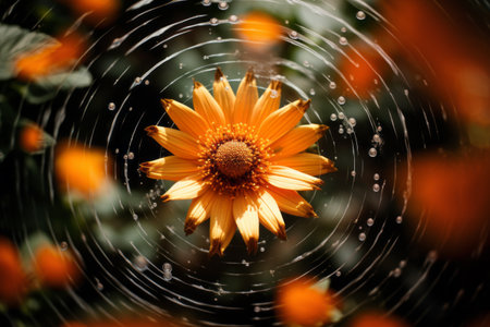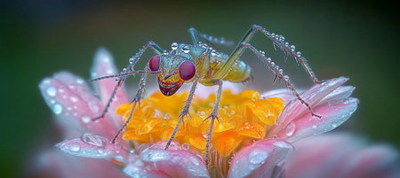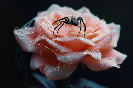 A small spider is perched delicately on a beautiful flower that has glistening water drops resting on its vibrant petals. Generative AI