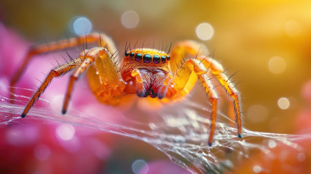 A close-up shot captures a pink spider with sparkling accents. The macro perspective showcases intricate details. The spider appears in a soft, diffused setting, possibly in a natural environment with vibrant hues. Suitable for illustrating educational content or adding visual interest to design projects.