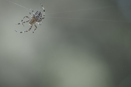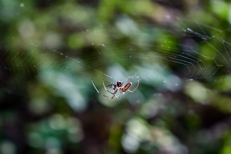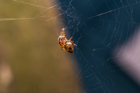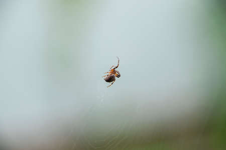 A spider weaves her net in the middle of the air with blurred background