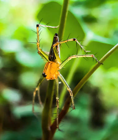 Yellow-black color spider siting on the green grass trees and green background in garden.