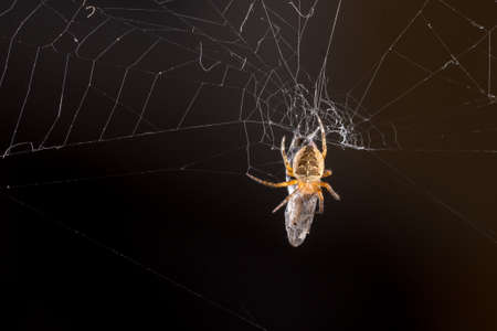 Spider eating fly caught in the net with black background.