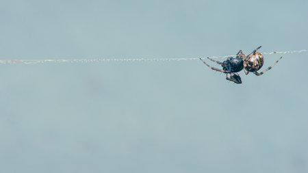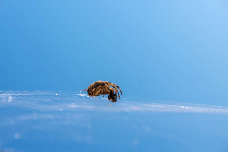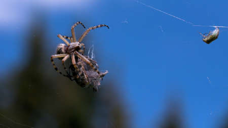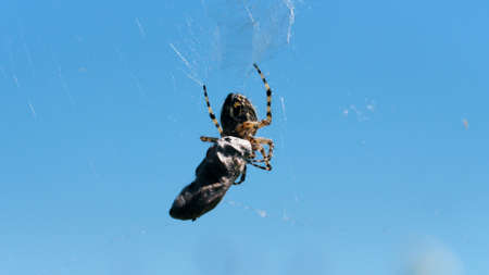 Cose up of hunting spider trying capturing a small insect in its web. Creative. Details of wild nature, a spider on blue sky background.