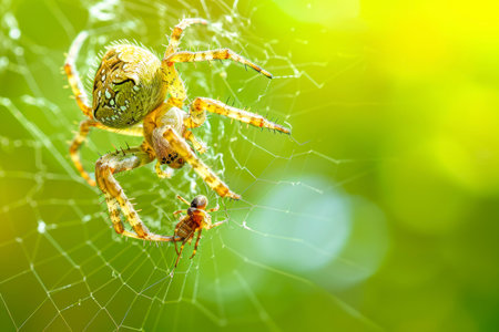 Spider and spider web in green nature or in the garden with copy space.