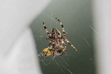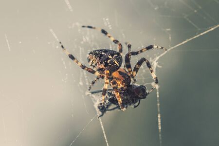 European garden spider (Araneus diadematus) eating in the spider web
