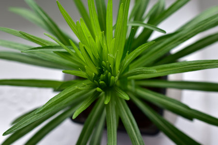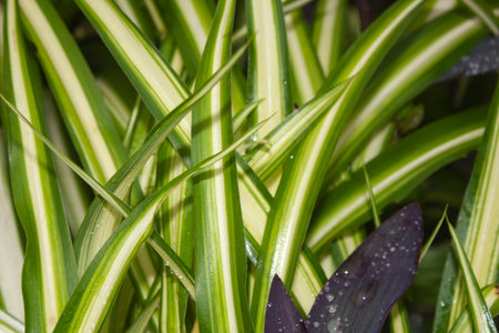 Indoor Spider Plant with Striped Leaves: Close-Up of Chlorophytum Comosum, a Vibrant Green Air Purifying Houseplant for Office and Home Greenery