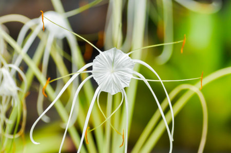 Close-up of elegant white spider lily flowers in full bloom amidst lush green foliage. The delicate petals and bright orange stamens create a striking contrast, highlighting the natural beauty and intricate details of this exotic tropical plant.