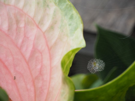 View of Lynx spider (oxyopidae) on green leaf. Photo shot on the mountain.
