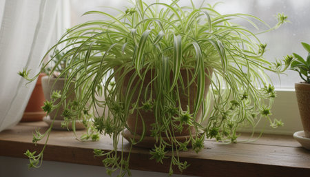 Chlorophytum (Spider Plant) on a wooden shelf on a window