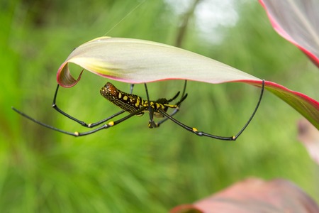 Big spider Nephila Pilipes weaving a web in the jungle on a colorful flower