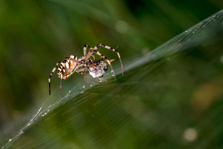European garden spider (Araneus diadematus) eating in the spider web