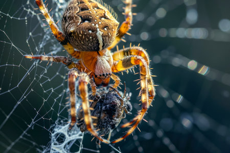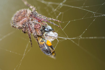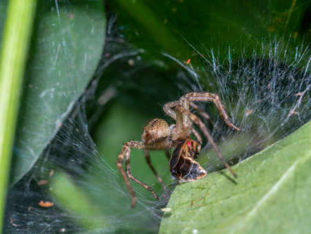 Spider eating its prey trapped in web