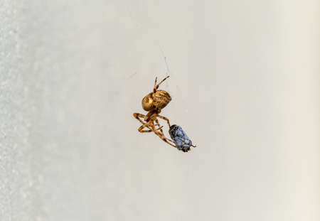 Spider and hers victim caught in the web near the brick wall