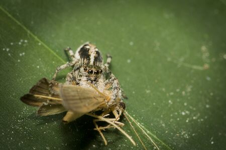 Small Gray Wall Jumping Spider of the species Menemerus bivittatus preying on a winged ant