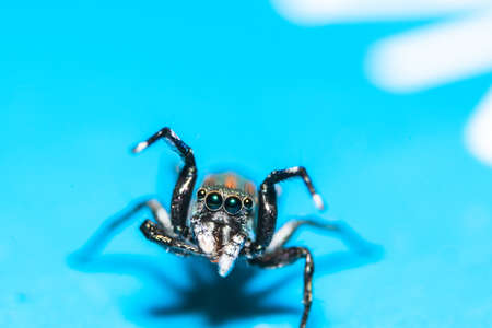 Macro shot of a jumping spider with big blue eyes. Macro
