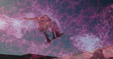 Flying skateboarder in jeans on skateboard at dusk skatepark ramp, with pink-purple light trails. Urban, adrenaline, dynamic, neon, performance, motion, energetic