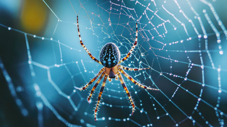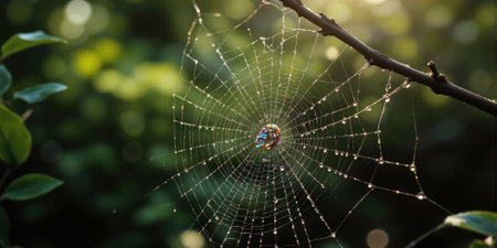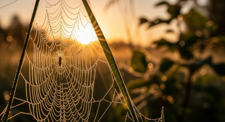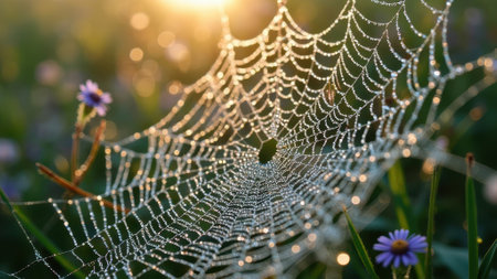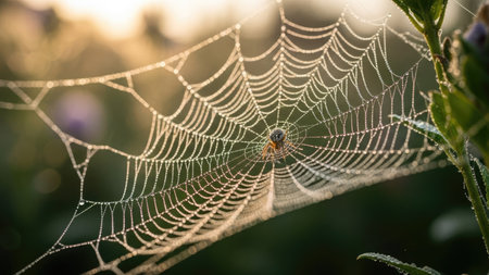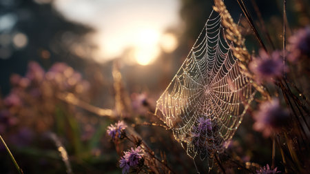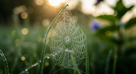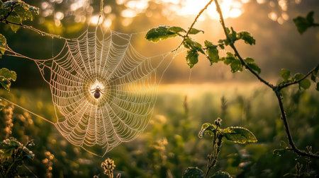 Delicate spider web is adorned with sparkling dew drops in early morning light. The design intricately showcases nature's artistry and beauty, capturing the essence of dawn