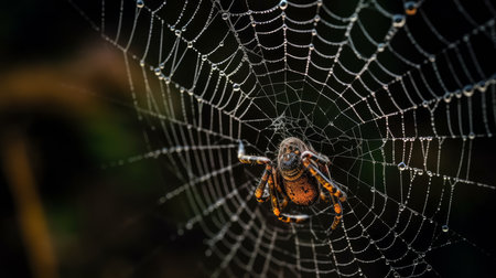 A stunning close-up image of a spider weaving a web adorned with sparkling dew drops, highlighting the intricate patterns against a dark backdrop, exemplifying nature's artistry.