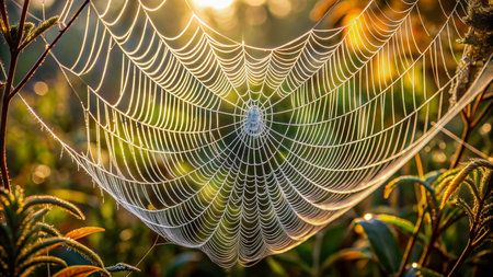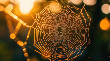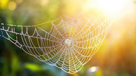 A stunning closeup of a spider web adorned with morning dew, illuminated by the soft glow of sunlight. This serene nature scene captures the beauty of fragile artistry in the wild.