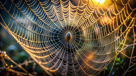A stunning macro shot of a dew-covered spider web illuminated by warm morning light, showcasing the intricate design and natural beauty of nature's artwork.