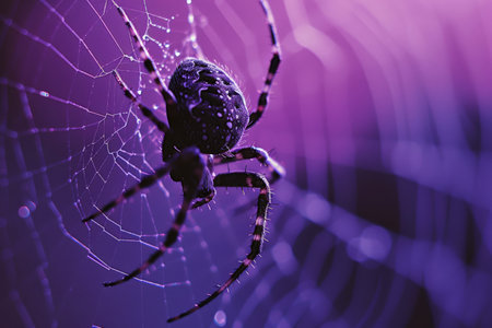 A stunning close-up of a spider web adorned with dew drops in soft purple light, showcasing nature's delicate beauty and intricate patterns at dawn.