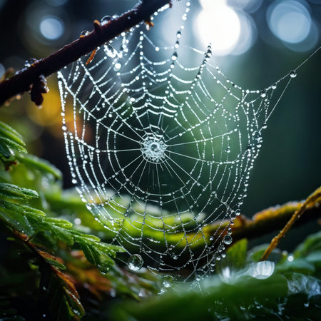 Morning Dew Spider Web Tiny water droplets cling to an intricate spider web, each one acting as a perfect lens