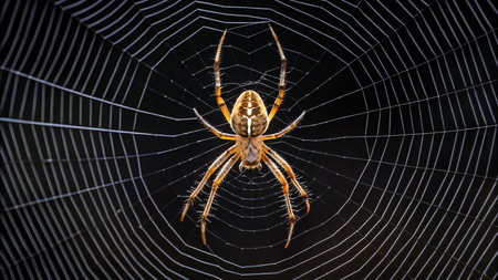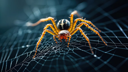 A close-up of a spider in the center of a golden web with dew drops glistening in the morning light, evoking a sense of natures intricate beauty.. AI Generation