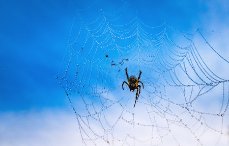 Spider rests on a dewy web against a clear blue sky. Water droplets create a glistening effect on the intricate web pattern. Capturing tranquility and natural beauty.