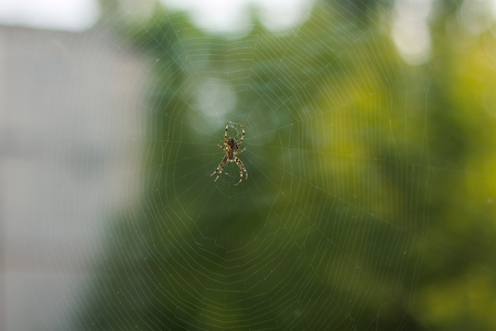 A spider weaves her net in the middle of the air with blurred background