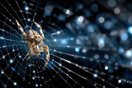A detailed close-up of a spider on its web, set against a dark background with bokeh lights, creating a mysterious and slightly eerie atmosphere.