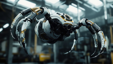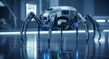 A high-tech robotic spider with a sleek, futuristic design, showcased in a modern indoor environment with a glossy floor.