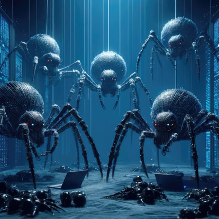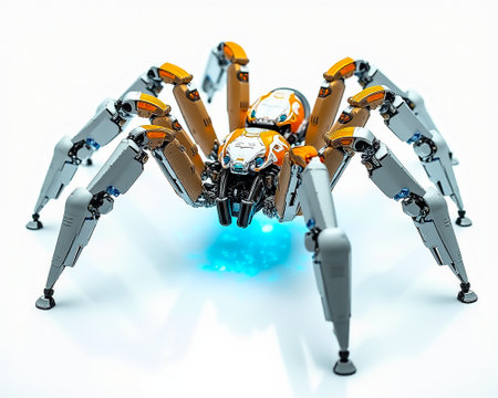 A detailed close-up of a metallic robotic spider with intricate mechanical legs and a glowing red core. The spider has a futuristic design.