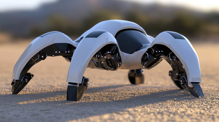 Futuristic Robot Spider Walking on Desert Sand at Sunset with Beautiful Colors in the Sky and Shadows Casting on the Ground