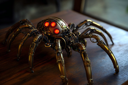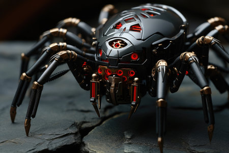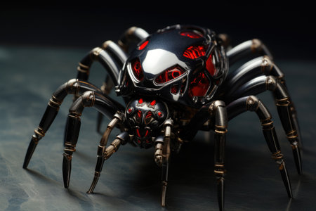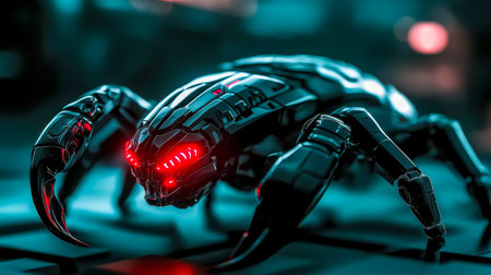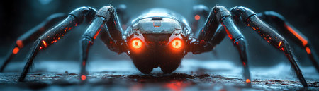 Robotic spider with glowing red eyes and metallic body. Dark background with a high-tech aesthetic. Concept of robotics, innovation, and technology in design and engineering.