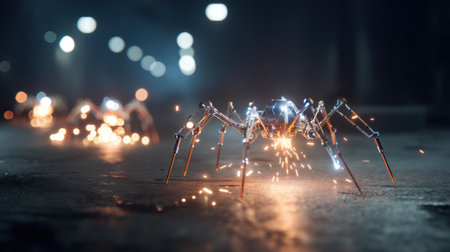 Discover a stunning futuristic robotic spider moving through an urban environment, with sparks flying and captivating illuminated details that reveal innovation and creativity.