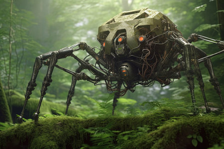Image of tarantula gundam robot technology an ectronic in the forest. Insect. Generative AI, Illustration.