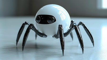 A sleek, sci-fi-inspired arachnid robot with a reflective white orb and agile black limbs, poised on a polished surface, embodied advanced technology